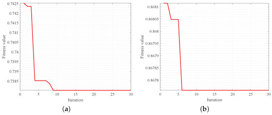 The WOA-VMD-BD method was employed to process the data above. The WOA searches for the parameters of the VMD. The initial value of the parameter combination [K, ] was set between [1000–9000, 3–9], with 10 WOA search agents and 30 iterations. The permutation entropy (PE) was used to calculate the fitness value of WOA to optimize the parameters of the VMD method iteratively. The fitness value convergence curves of the iterative update in HH and HV polarization modes are shown in Figure 13. The fitness values converge in the 12th and 5th iterations, respectively, and the minimum fitness value is 0.76 and 0.81.