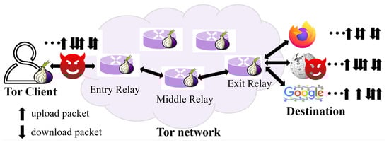 We assume that the attacker can monitor the circuit between the client and the entry OR because the Tor network is made up of volunteer nodes from all over the world, and the security of the volunteer nodes cannot be guaranteed. In this scenario, it is assumed that the attacker has the ability to monitor node communication. While monitoring the communication, the attacker cannot know anything about the real payload by decrypting it because Tor uses multiple layers of encryption. On top of that, researchers typically assume that the adversary cannot break Tor’s encryption algorithms, so it can only record and observe traffic as a passive attack, meaning it cannot observe the rest of the network and cannot modify, delay, discard, or populate new packets in the original flow. As a result, attackers are difficult to detect. Previous work has shown that WFP attacks can be carried out by all the entities with this level of access to network traffic, including autonomous systems (AS), local network administrators, ISPs, etc. By capturing traffic at the transmission control protocol (TCP) layer, WFP attacks can be launched at the ISP level [27,41]. In this study, we also assume that the attacker can monitor the beginning and finish of each webpage load.