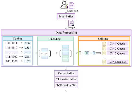The sender is the user’s OP. The sending data needs to go through the input buffer, data processing (encryption, data slicing, redundant coding, and other operations), and the output buffer, as shown in Figure 3. Tor’s data processing and forwarding functions are controlled by libevent’s read and write events [44]. When a read event is scheduled, the OP reads data from the input buffer and encrypts it with the session key of the three-hop ORs. The encrypted data will be converted into decimal units of 8 bits to facilitate the subsequent encoding process, and the converted data will be cut into s slices. Next, the slices will be redundantly encoded. Considering the actual demand and network quality, the redundancy degree s can be adjusted, which is determined by the sender. The detailed slicing and redundancy process is shown in Figure 3. After the data is processed by redundancy encoding, it will be split according to the number of circuits and the cell header field will be updated in real-time. Finally, a complete cell of 512 bytes in length is written to the cell queue for sending. If there is still data in the input buffer, the above operation is repeated until all the data is read. The write event is scheduled to write as many elements in the queue as possible to the output buffer. After that, another write event is called to write the elements from the output buffer to TLS layer encryption and converge them to the middle OR through the m-circuits.