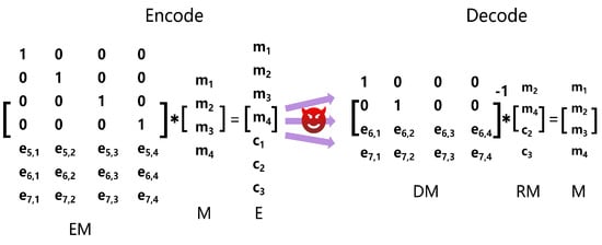The encoding coefficient matrices, EM, contain IM and CM. IM is the independent matrix of the first K rows, and CM is the circulant matrices of the last K rows, as shown in Equation (2). A circulant matrix is a special form of a Toeplitz matrix, and each element of its column vector is the result obtained by shifting the elements of the previous column vector to the right position in turn.