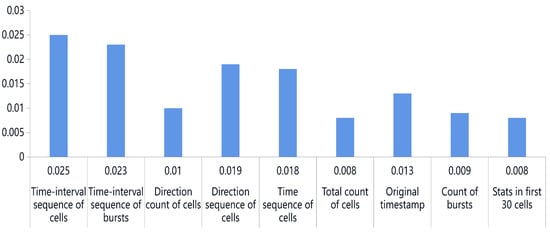 The represents the probability of the random event X, which is . The splitting strategy we adopt is that each path has an equal probability of being selected and the amount of data transmitted is equal. Assuming that the number of entry relays is , meaning the number of circuits is four, and the attacker has the ability to monitor one of the paths, the probability of the attacker obtaining 1/4 of the original traffic is 1/4, meaning , where . Another case is that the probability that the attacker does not obtain the original traffic is , and the calculated amount of information contained in the traffic features obtained by the attacker from one of the paths is . If the traffic only relies on single-path transmission, the probability that the attacker can obtain all the traffic features is , , so the calculated amount of information included is . It can be concluded that the amount of information contained in the traffic features obtained from the multi-path is greater, and the amount of information means that any uncertainty is eliminated. For the attackers, obtaining traffic features from the multi-path will be accompanied by more uncertainty. This means the uncertainty of the WFP classification increases, which causes the accuracy of the classifier to decline. This also means that the multi-path defenses only disclose limited useful signature information to the attackers. Therefore, we prove theoretically that the multi-path can reduce the density of the statistical features of the traffic, and can productively reduce the success rate of WFP.