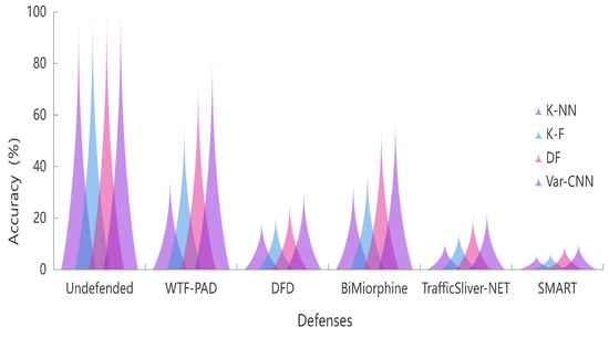 Currently, the most advanced and effective defense methods include WTF-PAD [11], BiMiorphing [48], DFD [36], and TrafficSliver [39]. We use the same dataset and classifiers to test the effectiveness of different defenses. In Figure 8, we can observe that SMART significantly outperforms WTF-PAD and BiMiorphing, with a direct drop in accuracy of about 90%. We believe that the effectiveness of DFD in DF and Var-CNN looks higher because it is used to change the original traffic pattern with the simultaneous injection of dummy packets both unilaterally and bilaterally, which clearly improves its perturbability at the cost of significant network overhead compared to our no-padding and no-delay defense. We will compare the network overhead of the schemes. It has been experimentally verified that our defense approach reduces the WFP accuracy rate better than most previous defense approaches.