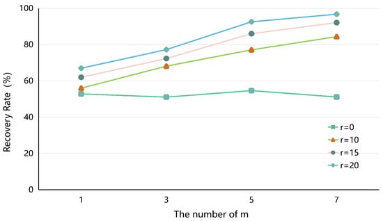 It is our most important goal to both ensure users communicate normally and protect user privacy. In other words, defense against WFP attacks must be based on the premise that users can work properly, so we must ensure the reliability of user data transmission. Here, we simulate the data slice transmission process through a simulator, and during the experiment. We artificially discard some data or interfere with the slice transmission sequence to evaluate the final data transmission success rate. Redundant slicing is an important basis for SMART to ensure the reliability of data transmission. We designed three control experiments with different redundancy values r, including (r = 0, 5, 10, 15, and 20), and different numbers of circuits (m = 1, 3, 5, and 7). Respectively, the process of slicing and the recovery of 1000 data was repeated five times. The data recovery is observed by fixing the number of redundant slices r constant or the number of m constant, and Figure 9 is the average data recovery rate (transmission success rate). We observe that the data recovery capability gradually increases when the proportion of the anonymous multi-path rises; the success percentage of multi-path transmission also gradually increases with the increase of redundant slices r.