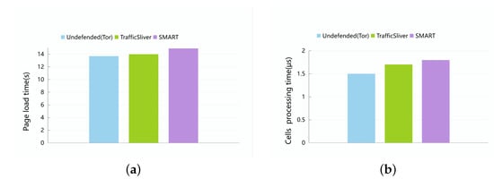 In the actual Tor network, we built a number of entry and middle ORs, and we deployed a Tor client that performed traffic slicing, redundancy, splitting, and merging policies based on pre-defined policies. Our middle OR supported both the regular single-path circuit and multi-path circuits to allow flexibility in responding to user needs. The Tor client we deployed applied the automated approach proposed in previous work to collect all traces during the crawling of datasets as in the related work [6,7,8,39]. For each page load, we used the tcpdump and Tor Browser 9.0.1 toolboxes to record the metadata, such as the TCP packet size and direction, and we applied the cell format we created. In addition, we removed traffic that showed page load errors or denied access, as attackers do not care about traffic with faulty page loading.