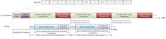As shown in Figure 3, the DFRC data stream is divided into multiple time slots which correspond to different optimal transmit-receive beam pairs. In each time slot, only when the beam of the RSU and the vehicle are aligned to each other, can the downlink quality-of-service (QoS) be guaranteed. In each time slot, the DFRC signal is partially reflected by the vehicle and partially received at the vehicle, therefore sensing and communication tasks are executed in parallel. In time slot 1, some initial access processes need to be performed first, i.e., the RSU completes the channel measurement by transmitting the downlink pilot and receiving the uplink feedback and thus obtains the initial AOD and AOA. Then the RSU transmits the DFRC signal and the vehicle receives the signal by using the optimal transmit-receive beam pair, followed by the vehicle for uplink feedback transmission. In parallel, the RSU receives radar echoes with a time delay from the vehicle and uploads them to the ES, where AOD prediction based on multi-RSU cooperation is performed. The prediction will then assist in the calculation of beamforming vectors for future moments.