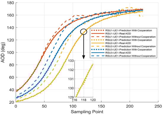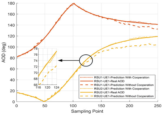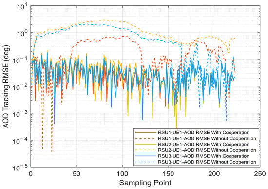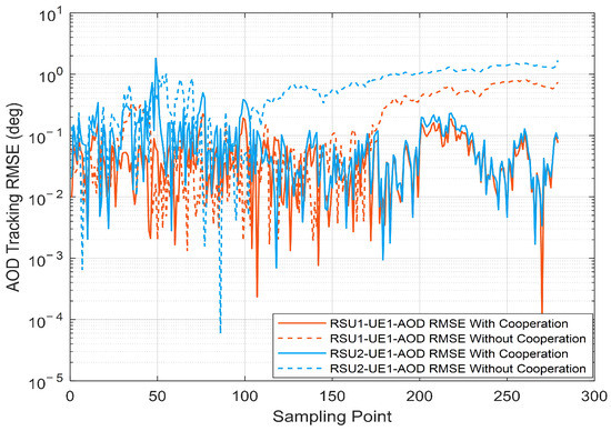 To evaluate the beamforming performance, we investigate the tracking of AOD during vehicle motion of the V2I network by EKF. Figure 6 presents the tracking performance of AOD per RSU versus the sampling point, both cooperative and non-cooperative. It is shown that the prediction accuracy of AOD can be improved by multi-RSU cooperation, which is closer to the real physical angle. Multi-RSU cooperation integrates the prediction of RSUs with different sensing performances and improves the vehicle location prediction accuracy through distributed sensing, which in turn can improve the AOD tracking effect. As a comparison, the single RSU is easily affected by channel variations and noise. The predicted AOD is likely to deviate from the real AOD when the vehicle is close to the RSU, i.e., in the interval where the AOD changes rapidly. Correspondingly, in Figure 7, we demonstrate the results for radar sense in terms of root mean squared error (RMSE) for both cooperative and non-cooperative AOD tracking. Simulation results show that the angular error predicted by the EKF without multi-RSU cooperation is particularly large and fails to correctly sense the real-time vehicle position.