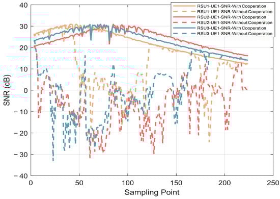 To evaluate the communication performance, Figure 8 presents the received SNR at the vehicle side versus the sampling point. Simulation results show that the variation of the received SNR of the vehicle with multi-RSU cooperation is stable, while that of the vehicle without cooperation is fluctuating drastically. The SNR is very related to the direction of the transmitted and received beams, and a higher SNR can only be achieved when both the RSU and the vehicle accurately direct their narrow beams toward each other’s direction. Therefore, beamforming based on accurate AOD tracking is a guarantee for higher received SNR. Moreover, in the linear mobility scenario, we assume that the AOD and AOA are equal, so the precision of AOD tracking affects both the transmit and receive beams, which in turn influences the received SNR even more.