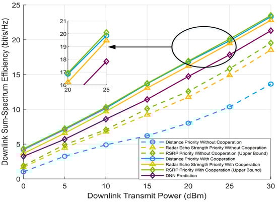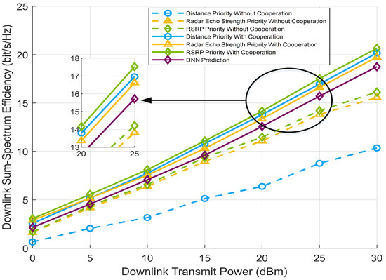 In addition, a deep neural network(DNN)-based beam prediction algorithm is evaluated and used as a comparison scheme. Specifically, the DNN used for training consists of one input layer, two hidden layers and one output layer, where the number of neurons in the hidden layer is set to 128 and an activation function is added between every two layers to enhance the model’s nonlinear modeling capability. The input of the DNN is the signal power received by the vehicle from the different RSUs at the previous moment. The output is the index of the optimal served RSU and the optimal beamforming angle (AOD) for the next moment. The RSU and vehicle can use the predicted RSU index and AOD from the DNN model to perform beam tracking in highly dynamic scenarios. Since the predicted metrics have both continuous values such as angle and discrete values such as the RSU index, the preprocessing of the data set is divided into two categories, with mean-variance normalization for continuous values and one-hot coding for discrete values. Moreover, both MSE and cross-entropy are used as loss functions and the Adam algorithm is applied to optimize the neural network. As shown in Figure 9, the spectral efficiency of the DNN prediction-based scheme is higher than that of the no-cooperation scheme, which indicates that the DNN model is able to learn the nonlinear correlation between multiple received signal powers and optimal beam directions. However, the accuracy of DNN prediction of AOD is limited by the types of features used for training and the learning capability of the network, while the massive MIMO-based beamforming system is particularly sensitive to beam angle errors, thus the spectral efficiency of the DNN prediction scheme is lower than that of the multi-RSU cooperation scheme proposed in this paper.