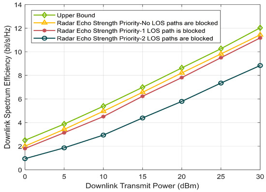 In Figure 10, the performance of the proposed scheme with LOS paths blocked is shown, which gives the variation of its spectral efficiency for different numbers of blocked LOS paths. Specifically, three RSUs are deployed for cooperation, and LOS paths exist between each RSU and the vehicle when there is no blocking. Since the RSU cannot accurately track the vehicle when the LOS path is blocked, which will provide a large error during the multi-RSU cooperation, therefore, it is necessary to recognize which RSU’s LOS path is blocked in the existence of blocking and exclude it from the cooperation. Considering that the reflection coefficients of obstacles and vehicles are different, the radar echo strength reflected by obstacles is lower, thus the radar echo strength is used to distinguish the blocked RSUs. The evaluation results are shown in Figure 10. When the LOS paths of all 3 RSUs are not blocked, the multi-RSU cooperation exploits the sensing information provided by all RSUs and thus has the optimal performance. When 1 LOS path is blocked, there are only 2 RSUs involved in cooperation, however, the spectral efficiency only slightly decreases, which indicates that 2 RSUs can still provide a large cooperation gain. When 2 LOS paths are blocked, multi-RSU cooperation cannot be performed, so the spectral efficiency is lowest.