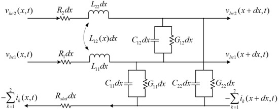 where vhc1(x,t) and vhc1(x + dx,t) represent the input and output voltage of one conductor. R11 and L11 represent serial resistor and inductor, C11 and G11 represent parallel capacitor and admittance. From the input and output ports, vhc2(x,t) and vhc2(x + dx,t) represent the voltage of the other twisted conductor; meanwhile, and represent the current of shielding layer. The other twisted conductor had similar parameters. Additionally, Rshd represents the resistor of shielding layer.