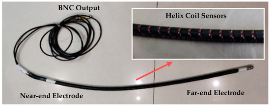 The experimental section is depicted in Figure 4. In order to compare the performance of sensors and electrode-pair antenna simultaneously, the sensors were installed conformal with the antenna cable using enameled copper wires. The near-end electrode and far-end electrode were mounted near both ends of the section.