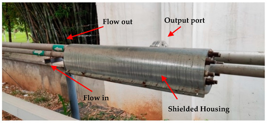 The experiments were conducted in the water-flow cycling experimental platform depicted in Figure 5, which was filled with 4% salt water to replicate saltwater. The platform consisted of a thick-walled aluminum pipe, through which salt water continuously flowed in and out. The experimental section was in shielded housing with an output port connecting to an LNA and a data acquisitor. The antenna’s end was attached to a vibrator in order to imitate various accelerations.