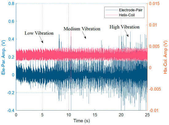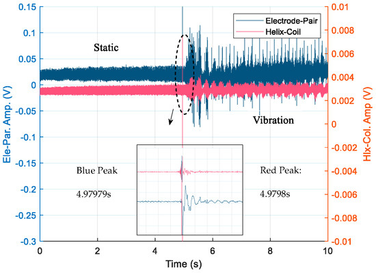 From static through vibration, Figure 6 depicts the received signals of the experimental area. The blue curve represents electrode-pair signals, whereas the red curve represents signals from the helix coil sensor. It was demonstrated that the amplitude of the electrode-pair towed antenna was greater when the electrode was exposed to water and generated additional polarization voltage [19]. In a period of 4.9798 s, when vibration occurred, both amplitudes varied significantly. Ignoring the latency of the cable and data acquisition, both the electrode-pair towed antenna and the helix coil sensor simultaneously identified motion-induced noise. Figure 7 depicts the fundamental and harmonic frequencies created by vibration.
