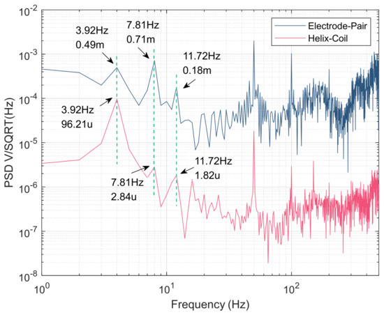 According to [20], the motion-induced noise is associated with the local vibration of the antenna cable, and variable vibration speeds produce noise signals of varying frequencies. As seen in Figure 9, the electrode-pair towed antenna and the helix coil sensor were able to detect three fundamental frequencies of 1.95 Hz, 2.93 Hz, and 3.91 Hz, as well as third harmonic frequencies of 6.84 Hz, 9.76 Hz, and 11.72 Hz, which corresponded to low, medium, and high vibration speeds, respectively. As the vibration speed increased, the frequency of the noise continued to rise.