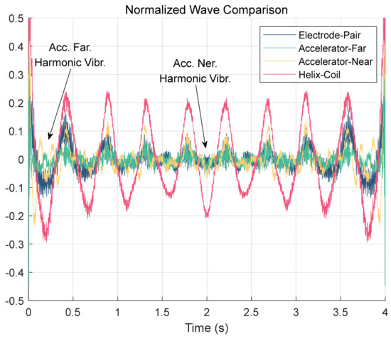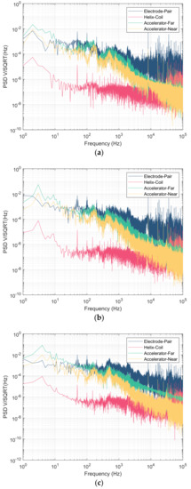 In Figure 11, the improved experimental section’s electrode-pair towed antenna, helix coil sensor, and far-end and near-end accelerator outputs are normalized. Figure 12 displays the power spectral curves at three vibrational speeds. Below 103 Hz, the curves of the electrode-pair towed antenna and two accelerators were similar; however, the sensor with the helix coil was around 20 dB less sensitive. As frequency increased, the accelerator curve dropped to the level of the helix coil sensor. According to wave equations [21], the instantaneous transverse displacement of a flexible cable is a function of numerous frequencies with varying attenuation and delay. Consequently, the near-end accelerator was further away from the vibrator than the far-end accelerator, resulting in a smaller power spectra curve.