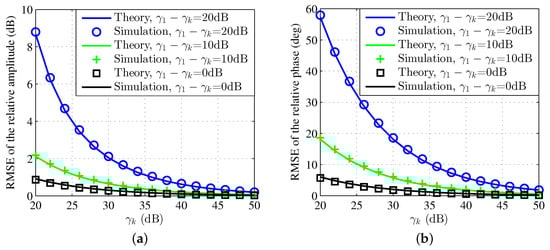 Figure 7 shows the RMSE of the relative amplitude and phase with unequal power conditions. Theoretical results are approximately by (