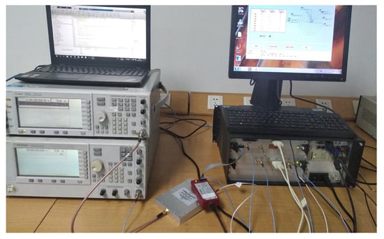 Figure 10 shows the experiment system for calibration. The computer generates a mixed baseband calibration signal and sends it to the vector signal generator (E4438C) through Ethernet. The mixed baseband calibration signal is composed of several calibration signals with different amplitude and phase relationships. The amplitude and phase relationships are set by MATLAB software on the computer. Another signal generator (E8257D) generates the operating clock for the calibration receiver. The calibration receiver collects the calibration signal with unknown amplitude and phase relationships through analog to digital converter (ADC) chip, and performs code correlation operation through the field programmable gate array (FPGA). Amplitude and phase measurement results are returned to another computer for display through Ethernet.