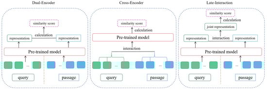 Retrieval models usually use dual encoders or cross-encoders, which are representation based and interaction based, respectively. Furthermore, the late interaction encoder is representation–interaction based (e.g., [