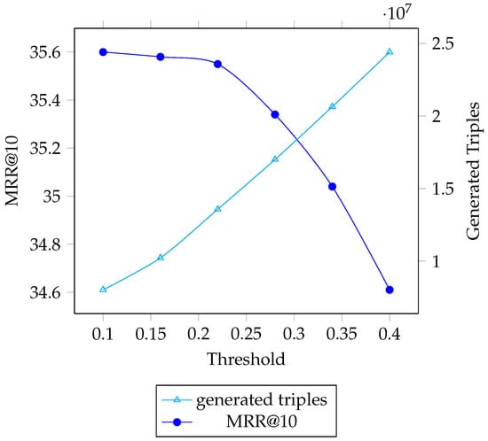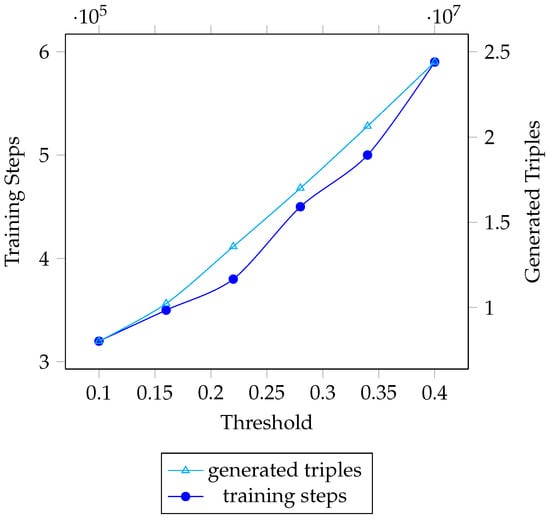 This figure shows the training steps for the model to perform best with different thresholds , which present different amounts of new triples, the model costs much more computational resources when is too big. Every 100,000 training steps cost about 17 h for two NVIDIA Tesla V100 GPUs with 16G RAM to train.