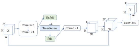 The LW-ViT block structure is shown in Figure 3. As can be seen from the structure diagram, for any processed feature map X∈, H, W and C represent the height, width, and number of channels of the image, respectively. The image data are processed by two convolutional layers: a standard convolutional layer and a convolutional layer, yielding an image feature of ∈. The purpose of the convolution layer is to extract local spatial feature information, and the purpose of the convolution layer is to change the number of channels of feature information, i.e., adjusting channel C to channel d, where . To enable the model to learn the global representation, ∈ is expanded into N non-overlapping patches ∈ by the unfold operation. Here, M = , is the number of patches, and denote the height and width of each token, respectively, and d is the number of channels, where . The L-layer standard ViT [], which primarily uses the multi-headed attention mechanism to compute the correlation between individual tokens, will process each token m∈. The direct fold operation yields ∈ after ViT processing, then after a convolution, the number of channels is changed to C and superimposed on the channels with X∈ (i.e., the number of channels is doubled), and finally, after the convolution, is processed to yield Y∈. The effective receptive field of LW-ViT is obtained from the principle analysis as , effectively reducing the computational effort of the model.