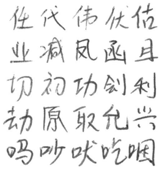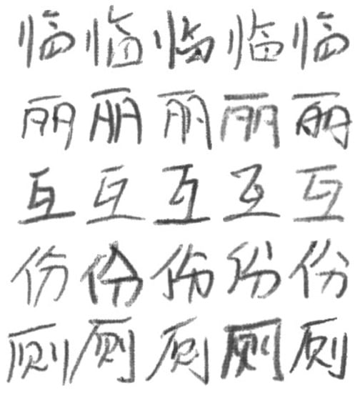 In addition, Figure 4 represents an example of several categories of Chinese characters in the dataset. It can be seen from these fonts that the Chinese characters are composed of many different strokes. In addition, all these Chinese characters are frequently used by people in their lives and are representative. Figure 5 represents the diversity of Chinese character writing characteristics, where each row represents the same character being written by different people. As can be seen from the figure, each person has their own unique writing habits, and even the same character varies greatly. Some people write with consecutive strokes or abbreviations, and this writing style can cause some recognition interference.