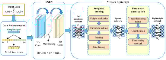 When there is rapid improvement in source number estimation techniques, the current algorithms have better estimation performance in the environment with a high signal-to-noise ratio but perform poorly in the case of a low signal-to-noise ratio. Since computer performance enhancement, deep learning techniques are widely applied in the field of signal processing [,,,]. In particular, CNN can replace the tedious manual extraction of data features by supervised learning with nonlinear fitting capabilities and thus achieve tasks such as recognition and classification. To further improve the feature extraction performance of CNN, scholars have continuously tried to increase the depth and width of the network. However, as the network model deepens, the network suffers from problems such as gradient dispersion and gradient explosion, which affect the training of the network. In 2015, the inception module was proposed to widen the network model in the GoogleNet network []. In the same year, the residual module was proposed in the ResNet network to solve the problem of continued training of its 152-layer network []. In [,], CNN increased with the number of layers and width of the network, although the accuracy rate increased, at the same time, the computational resources required by the network increased sharply, and training becomes more difficult. This is one of the main reasons why deep convolutional neural networks are difficult to be applied in mobile applications with limited computational resources and high real-time requirements. To solve the above problems, researchers have proposed many theories to achieve compression of large models, such as reducing the network model size, decreasing the number of parameters in the network model [,,,], and reducing the number of network model parameter bits [,,]. Low-power mixed-signal design technology in semi-programmable ASICs has been studied in the literature []. To balance the energy and precision of neural networks, Song Han et al. applied Huffman coding with pruning and quantization techniques, reducing the storage space by 35 times []. In the case of the ResNet network, Zhao, M et al. achieved network compression through a combination of knowledge distillation and pruning, resulting in faster reasoning speed and higher accuracy than the original network []. Scholars have classified pruning and quantization into various forms, such as static pruning, dynamic pruning, element-wise, channel-wise, shape-wise, filter-wise, layer-wise, and even network-wise pruning []. Additionally, some researchers [] have explored network architecture search algorithms to create optimized network models.