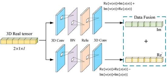 In Formula (5), the complex convolution process can be divided into two parts: the real part and the imaginary part . In order to realize the mapping of complex signals, two convolutional modules with the same structure are designed in Figure 3, respectively, corresponding to the real and imaginary parts of the output in Formula (5). Then, the output data is reconstructed to realize the mapping of complex convolution.