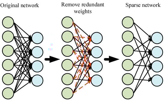 Aiming at the problems of redundant parameters, complex models and slow reasoning speed, the weight pruning method is used in this paper to reduce the structural complexity of the source number estimation network. The changes in neuron weight before and after pruning are shown in Figure 5. Firstly, regularization is added to the target detection network model for sparse training to obtain the scaling factor. Then, the proportion of channel importance in the convolution layer is calculated according to the distribution of the scaling factor. Finally, the convolution layer with a small contribution to the network model is cut off by calculating the dynamic threshold based on the scaling factor.