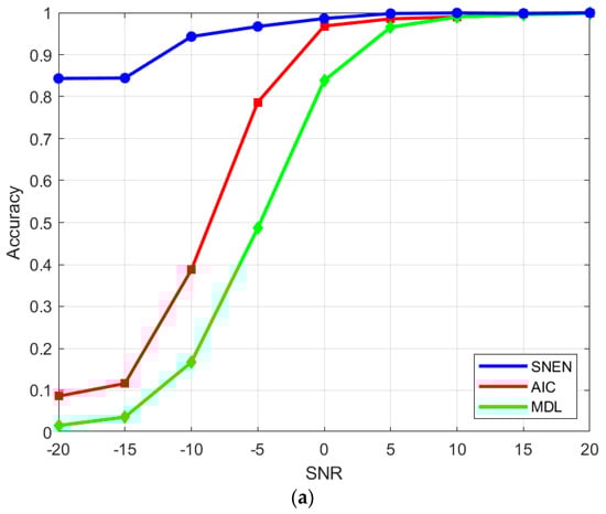 Figure 7a shows the accuracy of the source number estimation network with the AIC criterion and MDL criterion for estimating the number of sources at different SNRs. It can be seen that when , the accuracy of the traditional method and source number estimation network method increases with the increase of SNR. When , the accuracy of the 3 methods tends to be gentle, and all of them can reach more than 96%. Compared with traditional methods, the source number estimation network performs better at low SNRs. Even when , it still has 84% accuracy. When , the identification accuracy can reach 95%, and the number of sources can be estimated robustly. However, the traditional method cannot realize the robust estimation of the number of sources under the low SNRs.
