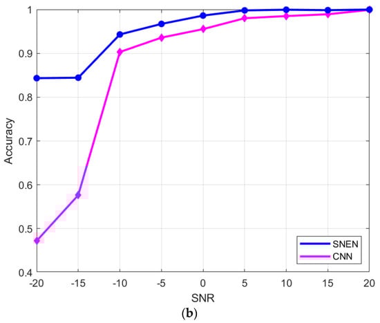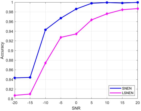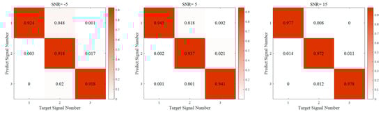 Figure 9 shows the confusion matrix of recognition accuracy of LSNEN under different signal-to-noise ratios. When , the classification accuracy can reach 92.0%. When , the classification accuracy can reach 94.1%. When , the classification accuracy can reach 97.5%. It can be seen that when the number of signals is one, the classification accuracy is higher.