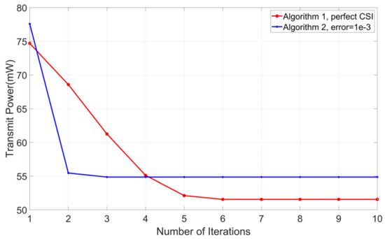 Figure 2 plots the convergence behavior of the proposed algorithm under perfect CSI and imperfect CSI in this paper, where the bound CSI error value is , and the transmit rate is . It is obvious that both Algorithm 1 and Algorithm 2 were monotonically convergent, where the number of iterations required by Algorithm 1 was significantly higher than Algorithm 2. Actually, Algorithm 1 reached convergence within iterations, while Algorithm 2 reached convergence within iterations. The main reason is that each iteration complexity of Algorithm 1 was much higher than Algorithm 2, which holds the same as the previous complexity analysis of the algorithm in this paper. However, the transmit power consumption of the CC under the required transmit rate in Algorithm 1 was lower than that in Algorithm 2, saving about .