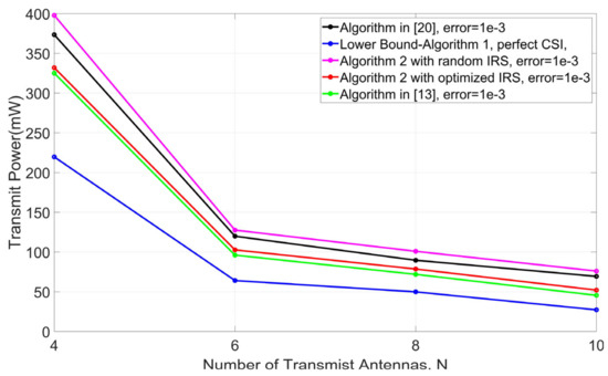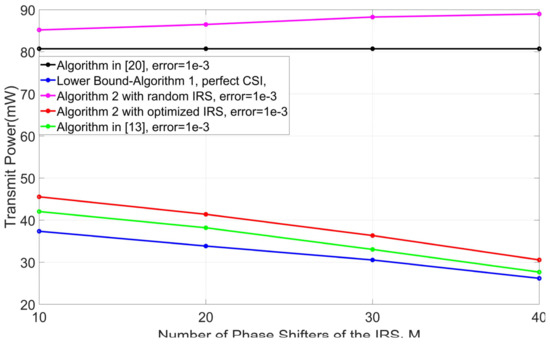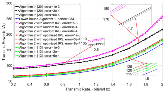 Figure 6 plots the effectiveness of the proposed algorithm under the phase shifters at the IRS, where the bound CSI error was , and the transmit rate value was . It is shows that the performance gap between the Algorithm in [13] and Algorithm 2 with optimized IRS was almost fixed with the increase in the number of phase shifters of the IRS. Moreover, the transmit power consumption achieved by Algorithm 2 with optimized IRS, Algorithm 1, and the Algorithm in [13] decreased with the increase in the number of the phase shifters at the IRS. For instance, in Algorithm 2 with optimized IRS, the increase in the phase shifters at the IRS from to when the transmit rate value was could effectively reduce the transmit power by about . In addition, the transmit power consumption in Algorithm 2 with random IRS was almost unchanged, which shows that the random IRS in wireless communication cannot improve the performance of the system with the increase in transmit rate value.