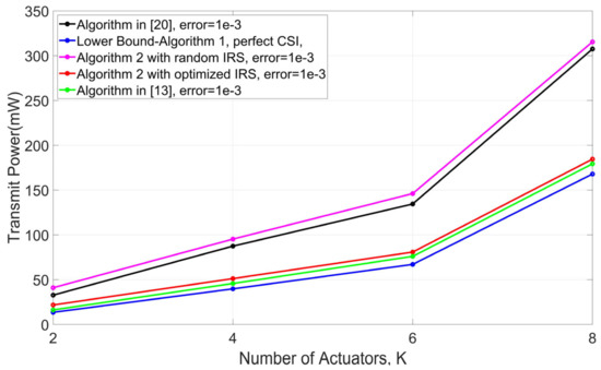 Figure 4 and Figure 5 plot the effectiveness of the proposed algorithm under the transmit antennas at the CC and the actuators, where the bound CSI error was , and the transmit rate value was . It is promising to see that the performance gap between the Algorithm in [13] and Algorithm 2 with optimized IRS did not increase with the increase in the number of transmit antennas and in the number of actuators. Moreover, the performance achieved by the Algorithm in [20] and Algorithm 2 with random IRS had a negligible performance difference. In Figure 4, the total power consumption decreased with the number of antennas increasing, which means that more antennas can provide a higher spatial degree of freedom, and the fixed actuators can compete for more resources. For instance, in Algorithm 2 with optimized IRS, the increase in the number of the antennas from to when the transmit rate value was could effectively reduce the transmit power by about . On the contrary, in Figure 5, the transmit power consumption increased as the number of actuators increased, which indicates that the fixed resources need to provide more actuators, and the interference term in SINR increased with the number of actuators increasing, which will inevitably increase the transmit power consumption at the CC.