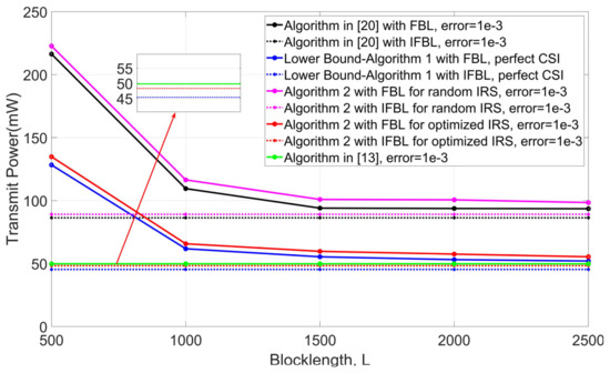 Figure 7 and Figure 8 plots the effectiveness of the proposed algorithm under the blocklength and the BER , where the bound CSI error was , and the transmit rate value was . As expected, in Figure 7, with the blocklength increasing, the transmit power consumption with finite blocklength (FBL) was close to that of infinite blocklength (IFBL). Furthermore, the transmit power consumption decreased with the increase in the blocklength under FBL. When the transmit rate value was , the transmit power consumption for the Algorithm in [13] was higher than that of Algorithm 2 with IFBL for optimized IRS by about . In Figure 8, the transmit power consumption increased with the decrease of the BER , where the value of on the X-axis actually was for simple expression. In addition, the absolute growth rate decreased with the increase in the BER. For system design purposes, depending on the QoS requirement in an IIoT scenario, an appropriate value of the blocklength and the BER can be chosen in Figure 7 and Figure 8.
