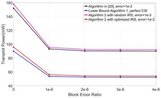 Figure 3 illustrates the effectiveness of the proposed algorithm under the impact of the transmit rate and the bound CSI error, where the bound CSI error value was , and the transmit rate value was . An interesting observation is that the total power consumption increased with the transmit rate value and the bound CSI error value, where Algorithm 1 served as a lower bound of the URLLC system, and the Algorithm in [13] served as a Shannon upper bound. As the transmit rate value increased, the corresponding SINR in Lemma 1 increased as well, and the channel dispersion in (3) can be seen as a constant. Thus, the performance gap between the Algorithm in [13] and the Algorithm 2 with optimized IRS did not increase with the increase in the transmit rate value. Moreover, the perfect CSI cannot be obtained in practice because of the uncertainty of the channel. Therefore, the performance of Algorithm 1 can only be utilized as the ideal evaluation index of the system. Subsequently, because of the impact of the bound CSI error value and the transmit rate value, the preference gap between Algorithm in [20] and Algorithm 2 with random IRS increased with the transmit rate value’s increase, such as the gap is about in , and the gap is about in . In addition, the performance gap between Algorithm 1 and Algorithm 2 with optimized IRS increased with the transmit rate value’s increase. Furthermore, the power consumption of Algorithm 2 with random IRS was much higher than that of other algorithms, which means that the random IRS in wireless communication cannot improve the performance of the system with the increase in transmit rate value.