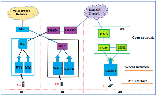 The 4G is an abbreviation for fourth-generation wireless, the stage of broadband mobile communications that precedes and surpasses 3G and 5G. The launching of every wireless cellular technology has boosted network capacity and bandwidth speeds. Users of 4G may expect speeds of up to 100 Mbps [6,7]. The network architecture of cellular communication technologies (2G, 3G, and 4G) is presented in Figure 2.