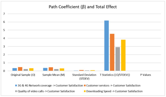 The statistical objective for the PLS-SEM demonstrates an essential t-value. Bootstrapping was conducted with the 500 resamples, and Bootstrapping is a non-parametric procedure for estimating the precision of the path coefficients (Hair, et al. 2014) [48]. The bootstrapping process is used to estimate the value t-value, p-value, and standard error for the statistical validity of the path coefficient (Hair, et al. 2014) [48]. Whereas values of β normally range between 0.329 to 0.346, which is normally considered an essential component. Parameters that have an at-value greater than 1.96 represent a 95% level of confidence (p < 0.05), and those parameters which have a t-value greater than 2.58 represent a 99% level of confidence (p < 0.01) (Hair, et al. 2014) [48]. Therefore, in the perspective of this study, t-values were found to be greater than 2.58, thereby showing the significance of path coefficients at (p < 0.01), 99% confidence level. The Path Coefficient (β) and Total Effect are presented below in Table 11. Figure 10 also shows the Path Coefficient (β) and total effect.