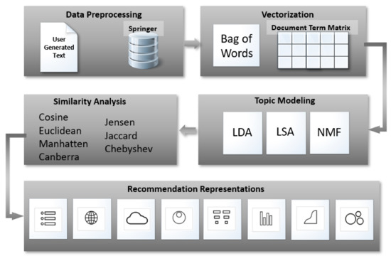 The general approach to identify similar publications by analyzing text in real time consists of commonly utilized natural language processing (NLP) approaches of preprocessing, vectorization of terms, topic modeling, calculating the similarity of the written text’s topic with that of available publications, and presenting the recommendations.