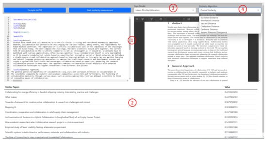 The result presentation was conducted alongside the latex editor workspace as illustrated in Figure 3. We decided to use the open-source Ace Editor as our Latex Editor, which we adapted for our test purposes. The editor is structured as the well-known Latex editors are commonly structured, with the editing or writing area and a PDF viewer (1). Adaptions are found below and above these two known areas. Below the editing area, the results are presented (2). The titles are clickable and are linked to the Digital Object Identifier (DOI). Once clicked upon, a new tab is opened, and the researchers can read the publication. Furthermore, for testing purposes, the similarity score is shown, which describes how similar the respective publications are compared to the text written thus far. The list of results is updated every two minutes. The researchers can choose their desired topic modeling approach via a dropdown (3). The current system has the three models described in this work; LDA, LSA, and NMF. The research can also choose a desired similarity algorithm via dropdown (4). Currently, there are seven similarity algorithms; Manhattan, Cosine, Jensen, Jaccard, Euclidean, Chebyshev, and Canberra. The standard choice, or predefined, combines Cosine and LDA. This decision is due to the evaluation results described in this work.