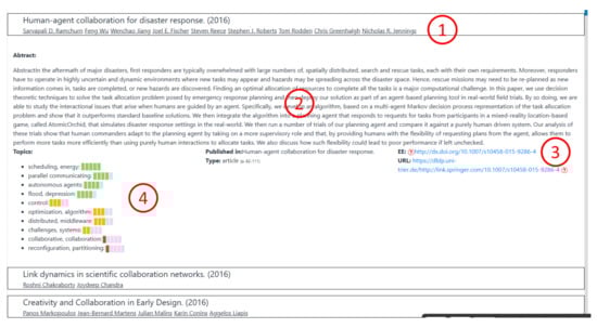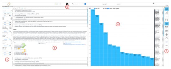 Figure 4 shows an alternative version of the UI focusing on visual analytics. The calculations and backend are the same; however, the frontend that is based on our previous works [8,28] grants the user the ability to explore the results better. The user has various filtering options seen in (2) while at the same time having a listed view seen in (1) that shows more information than Figure 3. Furthermore, the various visualizations shown in (3) allow them to explore and grasp information more efficiently. They can choose the visualizations they desire, which allows the system to adapt better to the cognitive needs of the researcher. Furthermore, by hovering over the visualization in (4), they can see further information, such as the number of publications connected to the respective topic.