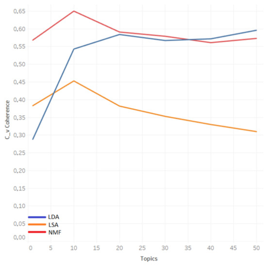 Figure 6 shows the plotted results of the C_v calculations. C_v utilizes the normalized pointwise mutual information (NPMI) score based on sliding windows to examine the top words in a document and the probability of them co-occurring. Based on these NPMI scores, topic vectors and topic word vectors are compared using cosine similarity. The average of these cosine similarities results in the C_v score. It can be seen that the NMF models were able to achieve the best C_v coherence values on average, while the LSA models performed significantly worse. The best NMF model was with ten topics and a value of 0.65. For LDA, the peak was 20 topics and a value of 0.57. LSA’s best model was with ten topics and a value of 0.45. In a second step, based on the results just described, ten additional models with 8 to 26 topics were trained using the data set for each topic modeling method. The goal was to determine the number of optimal topics as precisely as possible using the coherence values. Based on the results of the second step, we found that the NMF models also provided the highest average coherence values in this comparison. The NMF model with ten topics was the best model overall. The best model from LDA also consisted of 10 topics and performed slightly worse with a coherence value of 0.62. In comparison, the best model from LSA extracted eight topics, which received an overall coherence value of 0.49.