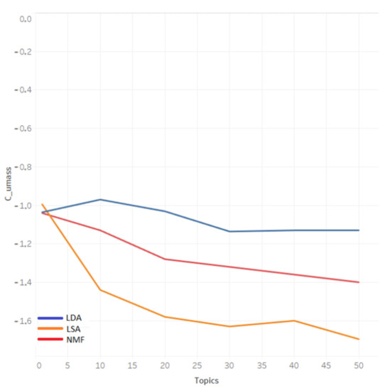 The procedure for calculating C_umass coherence is similar to the procedure for calculating C_v coherence described in the first part of the previous chapter. It also examines word co-occurrences, but it examines how often two words appear together in a corpus. It must be noted in the results that for C_umass, in contrast to C_v and C_uci, it is not the maximum value but the minimum value that is considered the optimum. As seen in Figure 7, this optimum was −1.7 for the 50-subject LSA model when LDA, LSA, and NMF were applied to the scientific data set. The LSA models performed significantly better than the LDA and NMF models, except for the model with precisely one topic extracted. On average, the LDA models provided the weakest C_umass coherence values, with 30 topics and a coherence value of −1.14. The best NMF model had a coherence value of −1.4 and, like the LSA model, consisted of 50 topics.