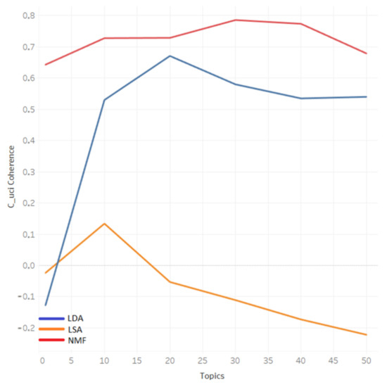 C_uci coherence represents the third variant of the coherence value determination used in this work to compare the topic model of LDA, LSA, and NMF. The procedure for calculating the C_uci coherence is similar to the procedure for calculating the C_v. C_uci uses a sliding window with pointwise mutual information (PMI) to compare word pairs. Figure 8 shows that NMF’s models produced significantly better results for each number of subjects, peaking at a model with a coherence value of 0.786 and 30 subjects. LDA provided moderately weaker C_uci coherence values, except for the models with one and five subjects, respectively. The best LDA model included 20 topics and came up with a coherence value of 0.67. The models of LSA, on the other hand, provided strikingly lower C_uci values than LDA and NMF.