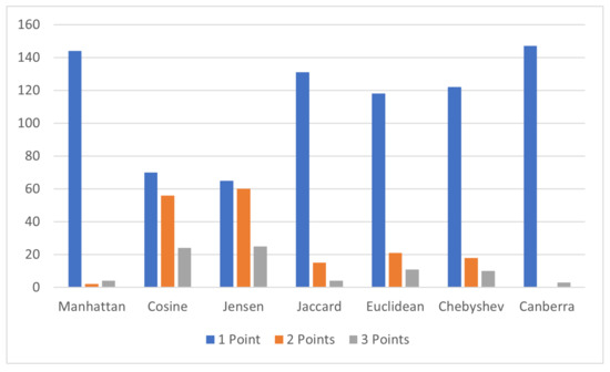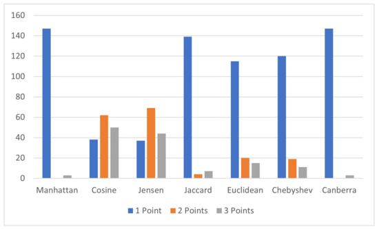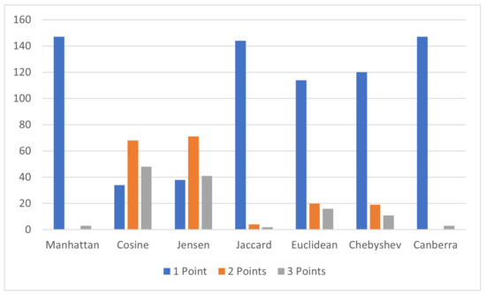 Figure 10 shows similar results to LDA with minimal differences. The previously mentioned Manhattan, Canberra, and Jaccard still cannot adequately identify relevant results; however, Jaccard’s results have slightly improved. During LDA testing, it yielded more than 140 publications considered useless, whereas, with LSA, it is slightly below 140, with an increase in results considered useful with three points. This slight improvement comes from the mid-length testing, which saw a slight improvement compared to LDA. Another difference is shown when examining the results of Cosine. Here Cosine has a decrease in two-point publications but an increase in useless and useful publications. Precisely four publications became useless, and two became useful. Jensen had a slight decrease in the one and two-point sections and an increase in the three-point section. This indicates that LSA had a slightly positive effect on Jensen and a slightly negative effect on Cosine.