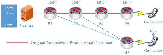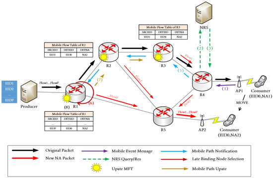 When the consumer moves, the destination NA in the data packets sent to the consumer will become invalid. The router can find the valid network address of the mobile entity in the NRS according to the identifier of the mobile entity. To support packet redirection, each router needs to maintain a Mobile Flow Table (MFT), which is composed of a group of Mobile Flow Table Entries (MFTEs). Each MFTE includes the source EID, the destination EID, and the destination NA, which is the latest network address of the destination EID. After receiving the packets, the router can support finding MFTEs according to the source EID and the destination EID or only according to the destination EID carried in the packets. If there is a matching MFTE, the router will replace the network address in the packet with the corresponding NA in the MFTE and then match the FIB for packet forwarding. If the match fails, the router will directly match the FIB for forwarding. Similar to MobilityFirst [34], we identify the function of the router modifying the destination address of the packets according to the identification (source EID and destination EID joint identification or destination EID identification alone) as a late-binding function, and we label the router that performs late-binding processing as a late-binding node (LBN). Access routers can sense the movement of mobile entities in some way. Perception is not the focus of this paper.