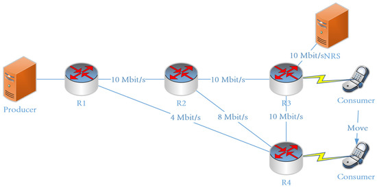 Scenario 1 is a scenario where a consumer requests a single form of content published by a producer. We fixed the number of data flows sent by the producer to 1, set the initial space occupancy rate of the MFTs of routers R1, R2, and R3 to 0.5, set the latency of the NRS responding to R3′s query to 1 ms, and adjusted the speed of data flows from 1 Mbit/s to 10 Mbit/s. Scenario 2 is a scenario where a consumer requests multiple forms of content published by a producer. We set the rate of each data flow sent by the producer to 1 Mbit/s, set the initial space occupancy rate of the MFTs of routers R1, R2, and R3 to 0.5, set the latency of the NRS responding to R3′s query to 1 ms, and adjusted the number of data flows from 1 to 10. Other parameters settings are shown in Table 2. In order to evaluate the performance of the mobility approach in terms of handover delay, we set the delay parameters of the NRS responding to R3′s query as 1 ms, 5 ms, and 10 ms on the basis of simulation for Scenario 1.
