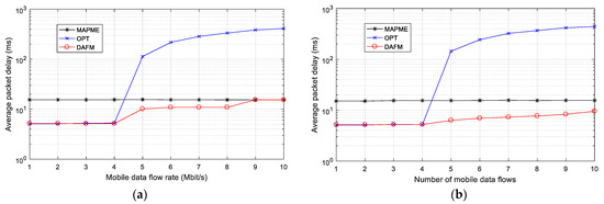 Comparison of average packet delays in different scenarios. (a) Average packet delay vs. mobile data flow rate; (b) average packet delay vs. number of mobile data flows.
