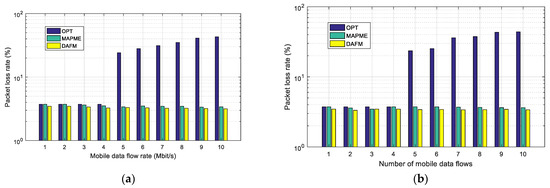 Comparison of packet loss rates in different scenarios. (a) Packet loss rate vs. mobile data flow rate; (b) packet loss rate vs. number of mobile data flows.