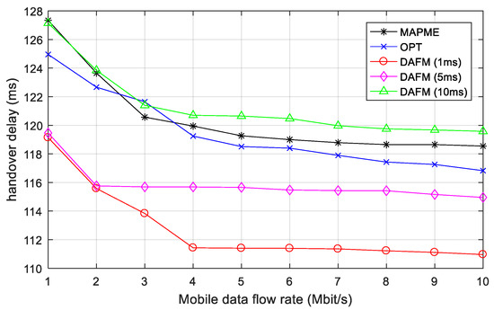 Figure 4b shows a comparison between the average packet delay and the number of mobile data flows for different mobility support methods in Scenario 2. We can observe that with the same number of mobile data flows, our proposal performs better in terms of average packet delay than MAP-ME and the OPT. Both the OPT and MAP-ME adopt fixed switching paths to transmit data. When the number of mobile data flows exceeds four, the bandwidth of the switching path used by the OPT cannot meet the requirements of data transmission, resulting in a significant increase in average packet delay. The bandwidth of the switching path adopted by MAP-ME can meet the requirements for transmission of data flows, so the average packet delay does not change with an increase in the number of mobile data flows. The DAFM allocates multiple data flows to different routers so that the data flows can be transmitted on different switching paths. Therefore, we observe that the average packet delay of the DAFM is lower than the average packet delay of MAP-ME.