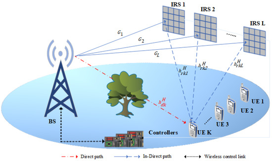- Action: The action at the time step t is constructed as the optimized variables of problem , i.e., the active beamforming, , and the passive beamforming vectors of all deployed IRSs, . Thus, the action can be defined asCorrespondingly, the instant action dimension is simply , where the complex-valued form is considered.